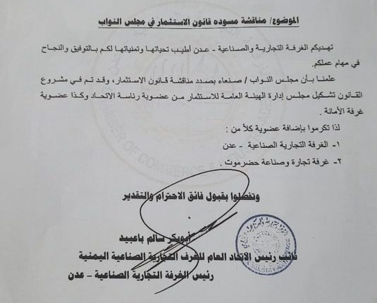 وقال وزير المالية في حكومة صنعاء عبدالجبار أحمد في تدوينة على ( إكس): ” في إطار جلسات التداول والنقاش مع اللجنة البرلمانية بدراسة مشروع قانون الاستثمار المقدم من وزارتي المالية والاقتصاد بحكومة التغيير والبناء، وصلتنا وثيقة خطاب هامة وملفتة من الغرفة التجارية الصناعية بمحافظتي عدن وحضرموت تطالب بإضافة تمثيلها في مجلس إدارة هيئة الاستثمار”.