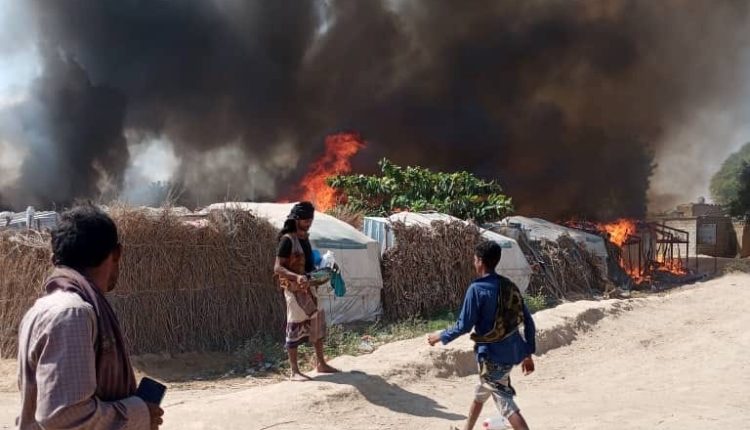 ألتهم حريق هائل اليوم الخميس أحد مخيمات النازحين في مديرية خنفر بمحافظة أبين جنوبي اليمن.