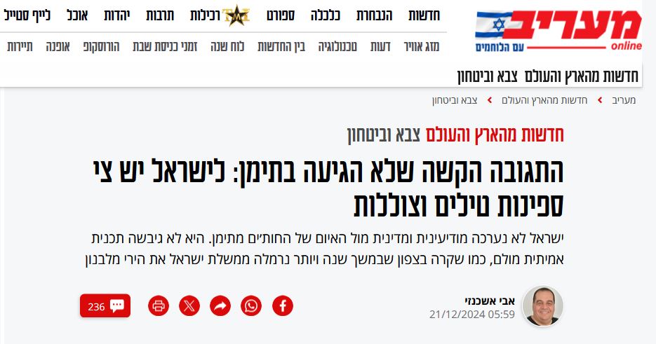 ووفقاً لمعاريف يواجه الجيش الإسرائيلي صعوبة في التعامل مع التهديد القادم من اليمن، سواء في الجانب الدفاعي أو الهجومي وبالإضافة إلى ذلك يتسبب اليمنيين منذ أكثر من عام في أضرار جسيمة للاقتصاد الإسرائيلي.
