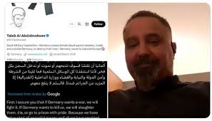 ونشر طالب على صفحته الرسمية بمواقع التواصل الاجتماعي تغريدات تستعض العداء السعودي – الألماني ويتحدث عن رغبة الالمان بقتلهم في إشارة إلى العلاقات المتوترة بين بلاده وبرلين.