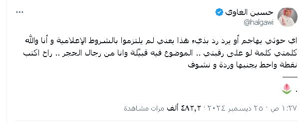 وكان الغاوي يطالب في تغريدات على صفحته الرسمية بمواقع التواصل الاجتماعي بعدم التعرض له من قبل  الناشطين اليمنيين وتحديد المحسوبين على  انصار الله، مشيرا على انه ملتزم بالتوجيهات العليا.