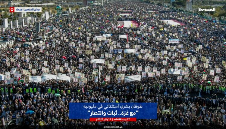 شهدت العاصمة صنعاء وبقية المحافظات اليمنية الواقعة تحت سيطرتها مسيرات مليونية كبرى نصرة وإسنادا للشعب الفلسطيني تحت شعار ” مع غزة.. ثبات وانتصار”.