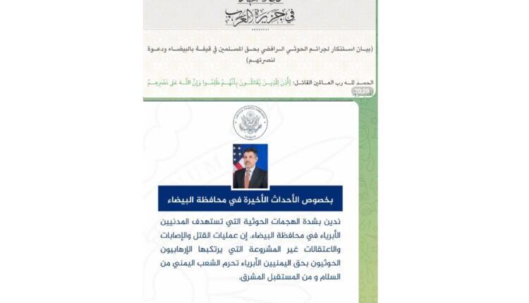 وفي دليل على ارتباط تنظيم القاعدة بشكل مباشر بالولايات المتحدة الأمريكية وأن من قاتلوا الأجهزة الأمنية في محافظة البيضاء خلال الأيام الماضية بغرض تفجير جبهة صراع داخلية في اليمن لإشغال صنعاء عن معركة إسنادها العسكرية لغزة، كان سفير الولايات المتحدة لدى اليمن المقيم في الرياض قد أصدر بيان إدانة للعمليات اليمنية الأمنية ضد عناصر القاعدة في البيضاء، ووصف عناصر التنظيم الذين قمعتهم صنعاء بأنهم أبرياء يمنيون موجهاً الإدانة بشدة لما أسماها “الهجمات الحوثية التي تستهدف المدنيين الأبرياء في البيضاء تحرم اليمنيين من السلام ومن المستقبل المشرق”، ليأتي بيان تنظيم القاعدة المتضامن مع بقايا عناصر فرعه المفكك في البيضاء ويكشف حقيقة مع من حاولت واشنطن التضامن معهم ومدى ارتباطهم بالولايات المتحدة.