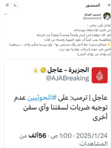 وقال العزي الذي يشغل عضو المكتب السياسي لأنصار الله، في تدوينة على صفحته في منصة (إكس): ” عاجل إلى ترامب : من الجيد الإحتفاظ بتهديداتك “.