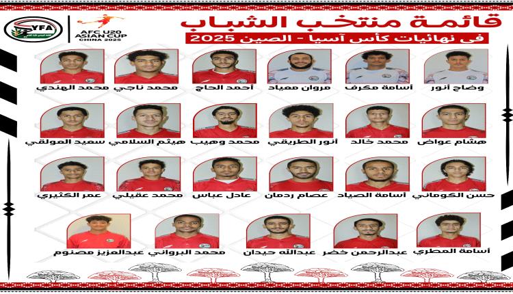 أعلن الجهاز الفني للمنتخب اليمني لكرة القدم فئة الشباب ، القائمة النهائية التي ستخوض نهائيات كأس آسيا للشباب في الصين، والتي ستنطلق في 12 فبراير الجاري.