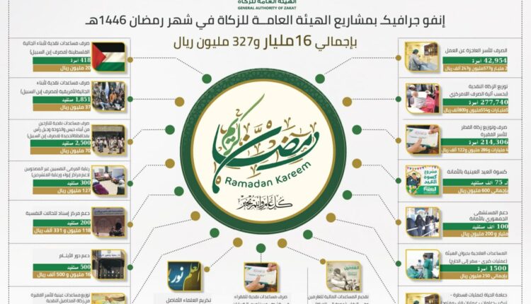 وشملت مشاريع الإحسان الرمضانية توزيع الزكاة النقدية لـ 277 ألفا و740 أسرة بحسب آلية الصرف اللامركزي بتكلفة خمسة مليارات و554 مليونا و800 ألف ريال، وصرف وتوزيع زكاة الفطر لـ 214 ألفا و306 أسر فقيرة بإجمالي أربعة مليارات و286 مليونا و122 ألف ريال، والأسر العاجزة عن العمل لعدد 42 ألفا و954 أسرة بملغ مليارين و577 مليونا و247 ألف ريال.