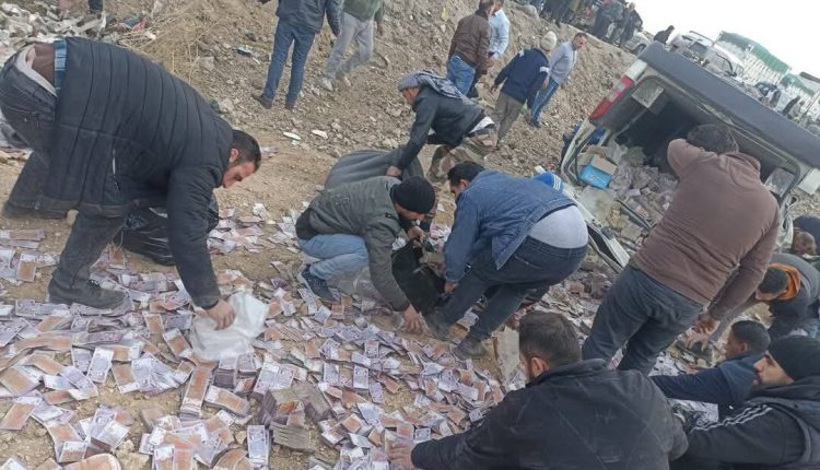 شاهد.. تطاير ملايين الليرات السورية على طريق حمص