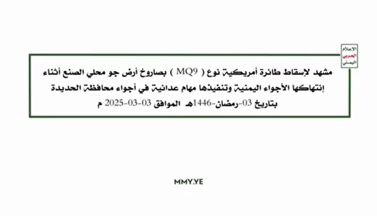 بثت قوات صنعاء مشاهد لإسقاط طائرة MQ9 الأمريكية بصاروخ أرض-جو محلي الصنع أثناء تنفيذها مهام عدائية في أجواء محافظة الحديدة بتاريخ 3 مارس 2025.