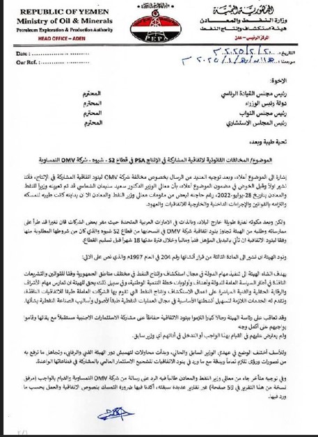 وفي نص الاستقالة، قال باحميش إن قيادة وزارة النفط مكنت شركة OMV النمساوية من الانسحاب من قطاع S2 – شبوة دون الالتزام بشروط الاتفاقية، وأن الوزارة لم تلزم OMV بإيجاد بديل مؤهل ماليًا وفنيًا قبل الانسحاب، ما يشكل مخالفة واضحة لاتفاقية الامتياز النفطي والقوانين المنظمة لهذا القطاع الحيوي، معتبرًا ذلك تفريطًا في حقوق الدولة وإضرارًا بالمصلحة الوطنية.