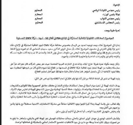 وفي نص الاستقالة، قال باحميش إن قيادة وزارة النفط مكنت شركة OMV النمساوية من الانسحاب من قطاع S2 – شبوة دون الالتزام بشروط الاتفاقية، وأن الوزارة لم تلزم OMV بإيجاد بديل مؤهل ماليًا وفنيًا قبل الانسحاب، ما يشكل مخالفة واضحة لاتفاقية الامتياز النفطي والقوانين المنظمة لهذا القطاع الحيوي، معتبرًا ذلك تفريطًا في حقوق الدولة وإضرارًا بالمصلحة الوطنية.