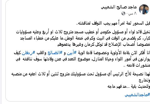 ودعا متحدث فصائل الانتقالي بالضالع ماجد الشعيبي رئيس المجلس لتسريح القيادات العسكرية المرتبطة بزوجتين او اكثر .. والشعيبي واحد من عدة قيادات داخل الانتقالي اثاروا قضية تعدد الزوجات على مستوى قيادات المجلس المنادي بالانفصال.