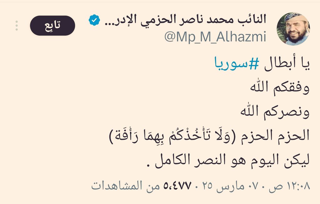 وقال القيادي في الاصلاح محمد الحزمي في تدوينة على ( إكس ) محرضاً على ارتكاب المزيد من المجازر : ” يا أبطال سوريا وفقكم الله ونصركم الله ، الحزم الحزم (ولا تأخذكم بهما رأفة) “.
