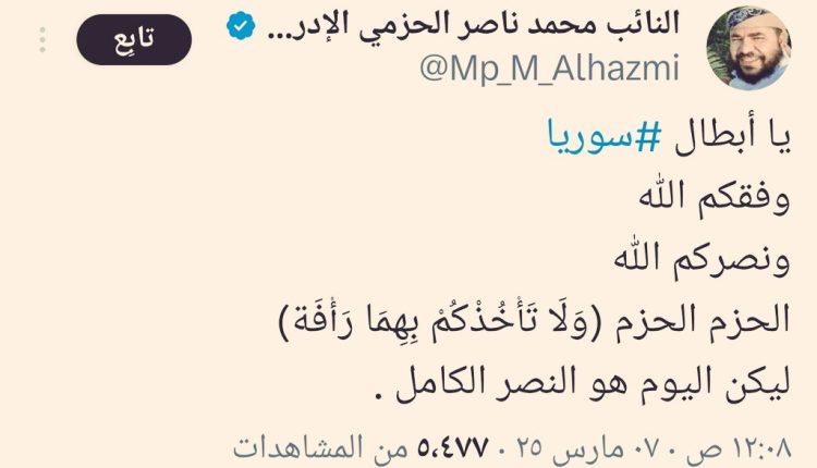 وقال القيادي في الاصلاح محمد الحزمي في تدوينة على ( إكس ) محرضاً على ارتكاب المزيد من المجازر : ” يا أبطال سوريا وفقكم الله ونصركم الله ، الحزم الحزم (ولا تأخذكم بهما رأفة) “.