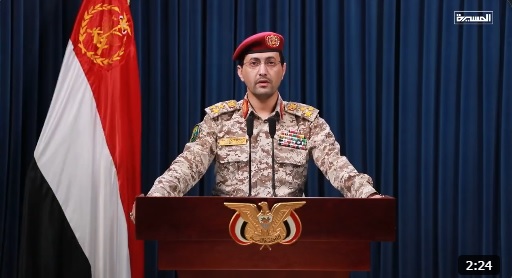 أعلنت القوات المسلحة اليمنية على لسان العميد يحيى سريع المتحدث الرسمي باسمها، عن استئناف حظر عبور كافة السفن الإسرائيلية في منطقة العمليات المحددة بالبحرين الأحمر والعربي وباب المندب وخليج عدن.