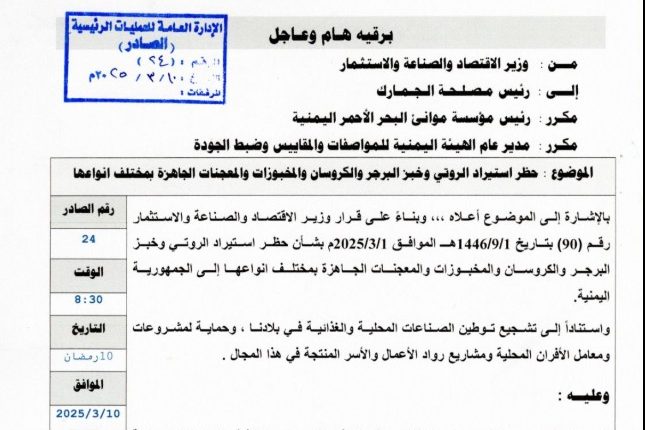 حظرت السلطات في صنعاء استيراد المخبوزات والمعجنات , وكذا أسطوانات الغاز المنزلي .