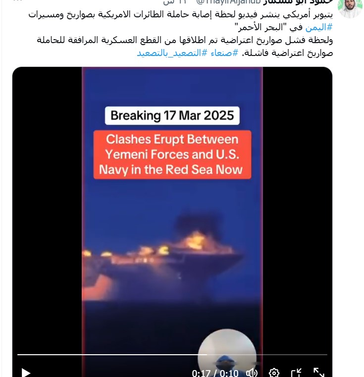 ويظهر المقطع عدة انفجارات على متن “ترومان” اضافة إلى لقطات لاطلاق صواريخ اعتراضبة من قبل حاملة الطائرات والغواصات المرافقة لها.