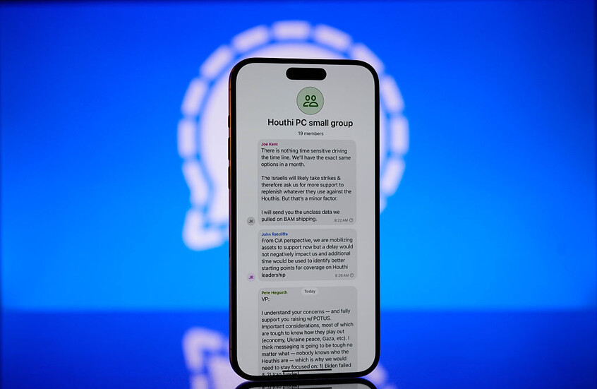 وضمت المحادثة الجماعية أكثر من عشرة مسؤولين رفيعي المستوى من إدارة ترامب، بمن فيهم نائب الرئيس الأمريكي ووزير الدفاع ، ومديرة الاستخبارات الوطنية ، ومدير وكالة الاستخبارات المركزية ، ووزير الخزانة ، ووزير الخارجية والأرشيفي المؤقت.