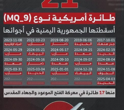 تمكنت قوات صنعاء من اسقاط مسيرة أمريكية جديدة من نوع ام كيو 9، وبهذا يرتفع عدد المسيرات الامريكية التي اسقطتها صنعاء من هذا النوع الى 21 طائرة.