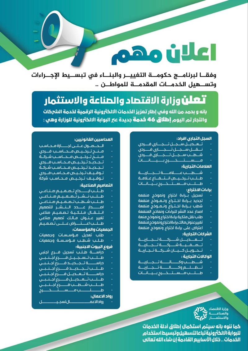 وتشمل الخدمات الجديدة وفق اعلان الوزارة ” تعديل سجل تجاري فردي – نقل سجل تجاري فردي – شطب سجل تجاري فردي – مستخرج بيانات – شطب علامة تجارية – طلب ترخيص انتفاع علامة – طلب مستخرج بيانات علامة – تسجيل براءة اختراع ونموذج منفعة – تجديد براءة اختراع ونموذج منفعة – شطب براءة اختراع ونموذج منفعة – اصدار عدد النشر للبراءات ونماذج المنفعة – طلب نقل ملكية براءة اختراع ونموذج منعة – تغيير عنوان مالك براءة اختراع ونموذج منفعة – اعتراض على براءة اختراع ونموذج منفعة – تعديل شركة تجارية – تصفية شركة تجارية – تحويل كيان شركة تجارية – شطب وكالة تجارية – تظلم وكالة تجارية – طلب مستخرج بيانات وكالة “.
