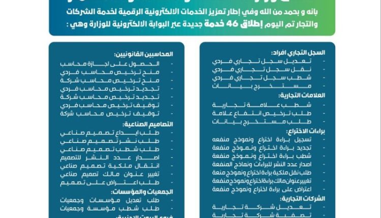 وتشمل الخدمات الجديدة وفق اعلان الوزارة   ”  تعديل سجل تجاري فردي – نقل سجل تجاري فردي – شطب سجل تجاري فردي  – مستخرج بيانات –  شطب علامة تجارية – طلب ترخيص انتفاع علامة – طلب مستخرج بيانات علامة –  تسجيل براءة اختراع ونموذج منفعة –  تجديد براءة اختراع ونموذج منفعة – شطب براءة اختراع ونموذج منفعة – اصدار عدد النشر للبراءات ونماذج المنفعة – طلب نقل ملكية براءة اختراع ونموذج منعة – تغيير عنوان مالك براءة اختراع ونموذج منفعة – اعتراض على براءة اختراع ونموذج منفعة –  تعديل شركة تجارية – تصفية شركة تجارية – تحويل كيان شركة تجارية – شطب وكالة تجارية – تظلم وكالة تجارية – طلب مستخرج بيانات وكالة “.