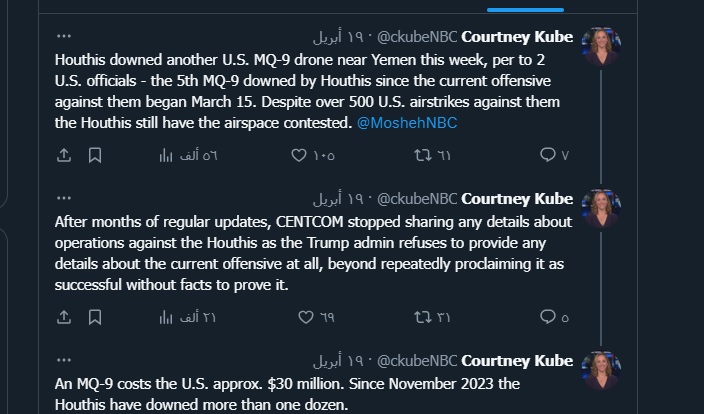 وقالت مراسلة القناة الأمريكية لشؤون البنتاغون والأمن القومي، كورتني كوبي، في منشور على حسابها بمنصة إكس، إنه “وعلى الرغم من أكثر من 500 غارة جوية ضدهم (منذ منتصف مارس الماضي) لا يزال الحوثيون يسيطرون على المجال الجوي”.