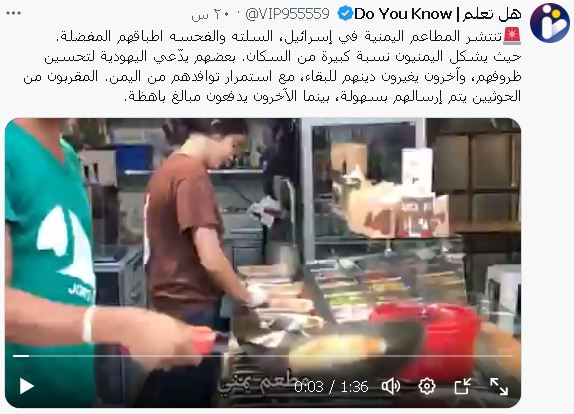 وتداولت منصات صهيونية بالعربية مقاطع فيديو ليمنيين في شوارع العاصمة تل ابيب .. وأفادت تلك المنصات بأن مطاعم “السلتة والفحسة” واطباق يمنية أخرى تنتشر بصورة كبيرة مؤخرا في المدن المحتلة بفلسطين ، مشيرة إلى أن غالبية السكان باتوا من اليمنيين.