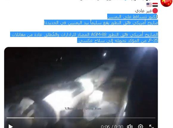 ونشرت منصة “الصين بالعربية” التابعة للخارجية الصينية مقطع فيديو يوثق لحظة قيام يمنيين بنقل صاروخ امريكي من نوع ” أي جي ام-88 المضاد للرادارات ..