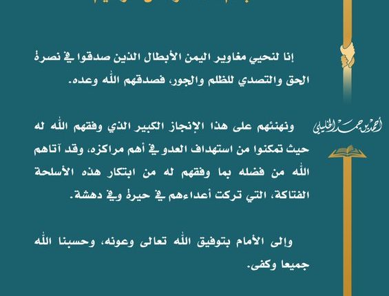 وفي رسالة وجهها على حسابه في منصة إكس قال ’’الخليلي : نحيي مغاوير اليمن الأبطال الذين صدقوا في نصرة الحق والتصدي للظلم والجور، ونهنئهم على الإنجاز الكبير باستهداف العدو في أهم مراكزه. وإلى الأمام بتوفيق الله تعالى وعونه.