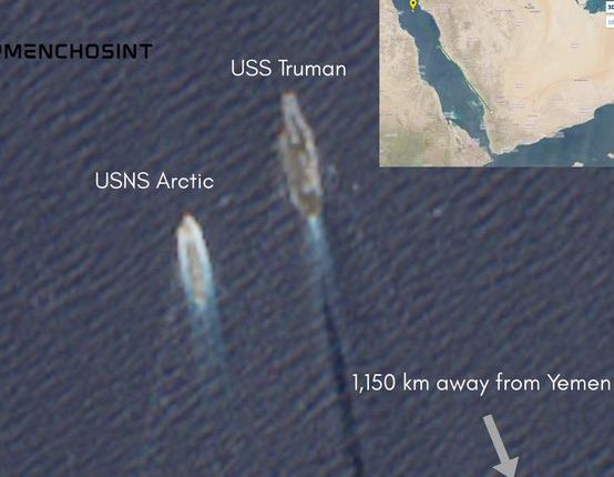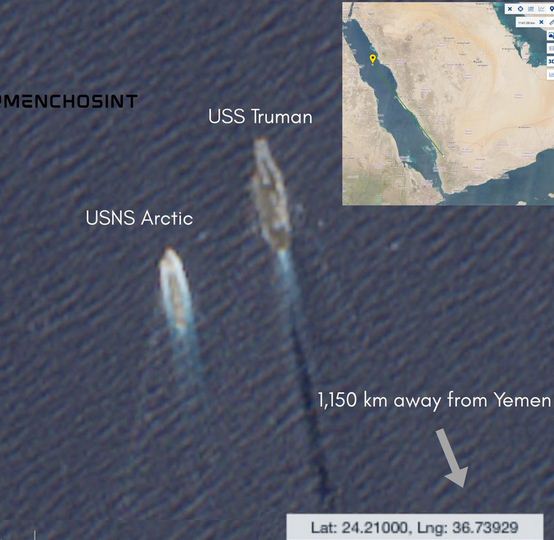 وفقا لصور تداولتها مواقع أقمار صناعية متخصصة بتتبع حركة الملاحة البحرية ظهرت “ترومان” وقطعها البحرية عصر الاثنين أي قبل الهجوم بساعات قليلة وهي تبحر باتجاه قناة السويس وقد ابتعدت اكثر من الف ميلا بحريا من اقرب نقطة على اليمن.