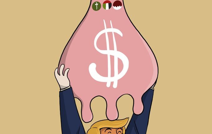 في الكاريكاتير، يظهر ترامب ممسكاً بابتسامة عريضة بكيس نقود ضخم على هيئة “ضرع بقرة” مطبوع عليه علامة الدولار، وتزينه من الأعلى رموز أعلام الدول الثلاث، في إشارة إلى أن الزيارة كانت تهدف بشكل أساسي إلى حلب دول الخليج واستغلال ثرواتها.