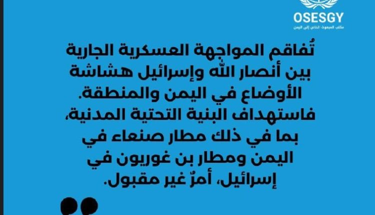 نشر مكتب المبعوث الأممي في اليمن هانس جروندبرج تعليقاً له بعد ساعات من قيام مقاتلات إسرائيلية باستهداف مطار صنعاء بصورة مباشرة .