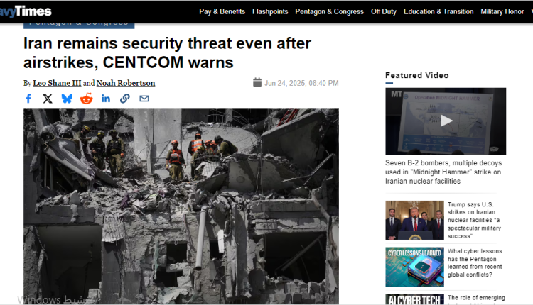 صحيفة “نافي تايمز” عن القيادة المركزية الأمريكية: إيران لا تزال تشكّلُ تهديدا أمنيًّا حتى بعد الغارات الجوية
