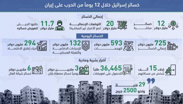 ووفقاً لتقرير نشرته صحيفة “يديعوت أحرونوت” تكبد الاقتصاد الإسرائيلي خلال 12 يوماً، فقط، خسائر مباشرة في قطاعي الدفاع والبنية التحتية بلغت نحو 6 مليار دولار.