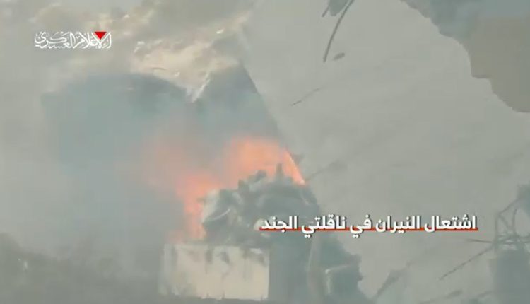 أظهر مقطع فيديو نشرته كتائب القسام الجناح العسكري لحماس عملية نوعية قام فيها مقاتلون برمي قذائف متفجرة الى داخل حاملتي جند إسرائيليتين بصورة مباشرة في غزة .