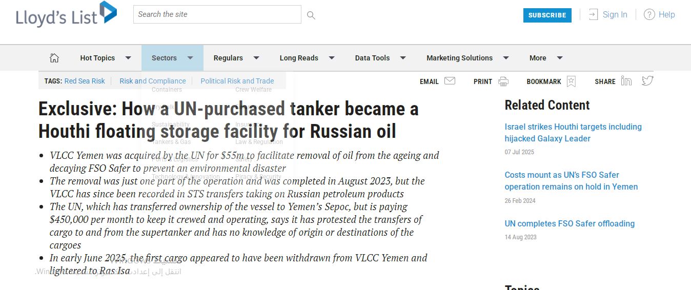 مجلة لويدز لست: كيف تحولت ناقلة نفط اشترتها الأمم المتحدة إلى منشأة حوثية عائمة لتخزين النفط الروسي