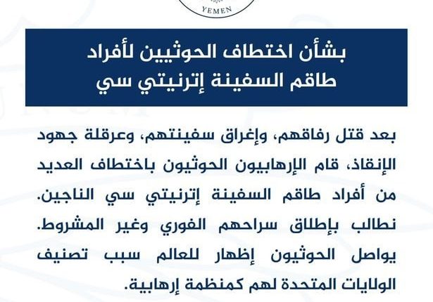 وزعمت السفارة الأمريكية ان “الحوثيين اختطفوا عددا من أفراد طاقم السفينة “إترنيتي سي” الناجين بعد قتل رفاقهم وإغراق سفينتهم” على حد وصف بيانٍ صادرٍ عنها .