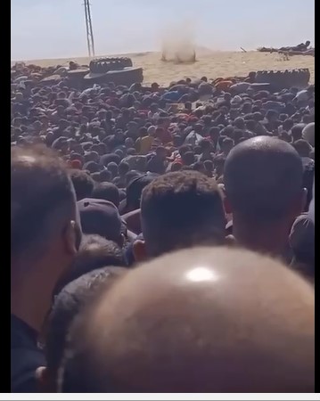 وتظهر مشاهد افتراش مئات ’’الغزاويين’’ الأرض امام ما تعرف بمراكز المساعدات وجيش الاحتلال يطلق الرصاص فوقهم مباشرة ومن يقف يتلقى “رصاصة الموت” قبل “كيس الطحين.