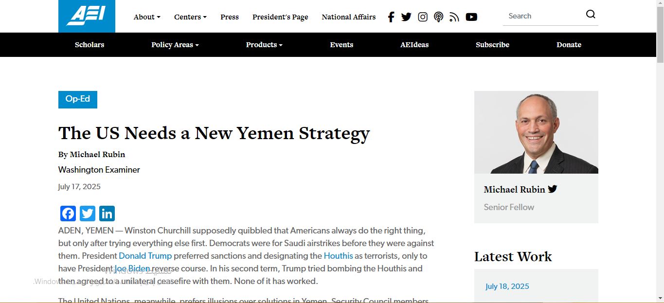 نشر معهدُ المشاريع الأمريكية لأبحاث السياسات العامة، اليوم، مقالًا ككاتب مايكل روبين من واشنطن إكزامينر حول اليمن.