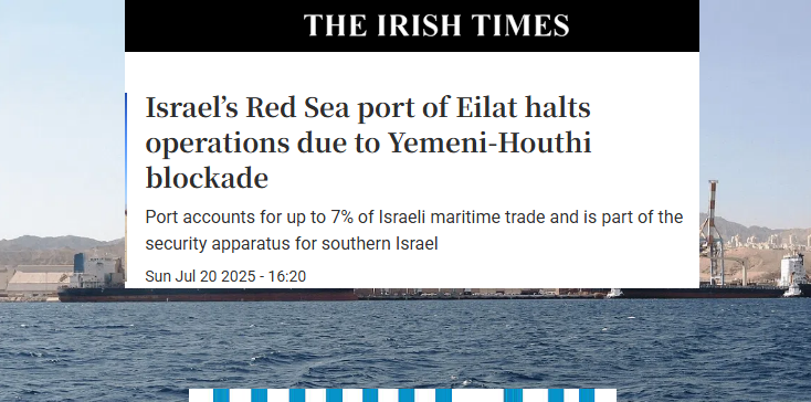 وأضافت الصحيفة الإيرلندية في تقرير صادر عنها الأحد 20 يوليو 2025م  أن ميناء “إيلات” كان يمثل ما بين 5 إلى 7 بالمئة من حجم التجارة البحرية للكيان، وكان جزءًا حيويًا من بنيتها الأمنية والعسكرية في جنوب فلسطين المحتلة، لكن منذ نوفمبر الماضي، ومع تصاعد عمليات الإسناد لغزة، بدأت السفن تتجنب الوصول إلى الميناء بعد أن وجهت صنعاء ضربات دقيقة إلى سفن أمريكية وبريطانية وإسرائيلية، بالتوازي مع استهداف مدينة “إيلات” نفسها بالصواريخ والطائرات المسيرة.
