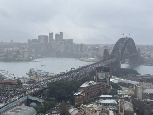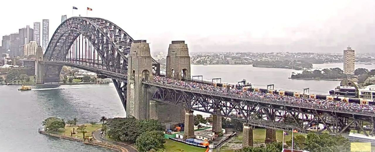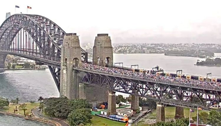 عبر نحو مئة ألف متظاهر “جسر هاربور” في سيدني رغم الأجواء الماطرة مطالبين بوقف جرائم الإبادة والتجويع في غزة .