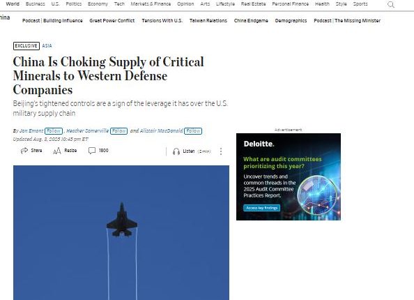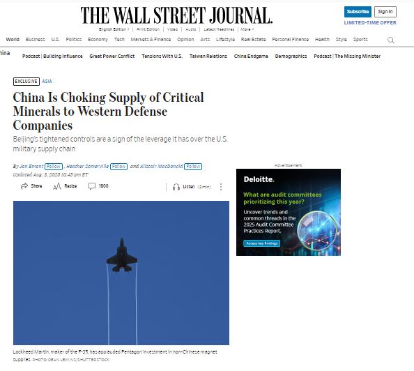 كشفت صحيفةُ وول ستريت جورنال الأمريكية أن الصينَ باتت تمارسُ سيطرةً مشدّدةً على تصدير المعادن الحيوية؛ ما أَدَّى إلى اضطرابات واسعة في الصناعات الدفاعية الغربية، وتأخر إنتاج معدات عسكرية حساسة، من الذخائر إلى الطائرات المقاتلة.