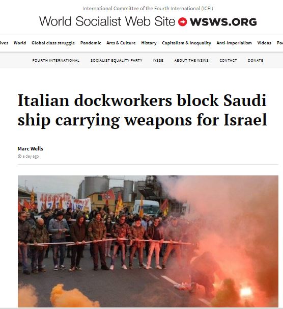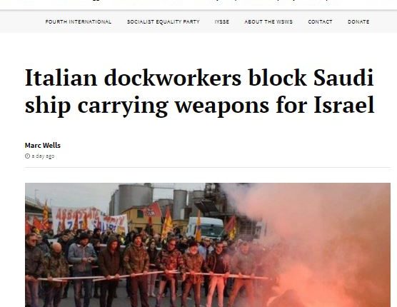 WSWS: سفينةٌ سعوديّة تنقلُ أسلحةً لـ(إسرائيل) وعُمَّالُ ميناء إيطالي يفرضون حصارًا لمنعِ عبورها