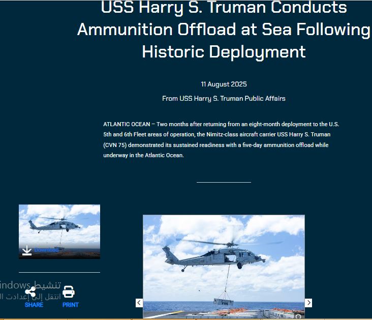 وبحسب البحرية الأمريكية، فقد جرى خلال خمسة أَيَّـام، بين 3 و8 أغسطُس، تفريغ ما يزيد عن 1300 طن من الذخائر من الحاملة “ترومان” إلى كُـلّ من حاملة الطائرات “يو إس إس جورج بوش” وسفينة الإمدَاد “روبرت أي. بيري”، في عملية أعقبت “نشرًا تاريخيًا” للحاملة في مناطق حساسة، من بينها المياه القريبة من اليمن.