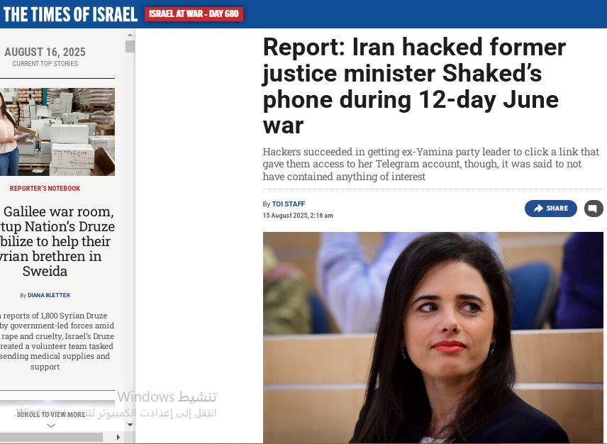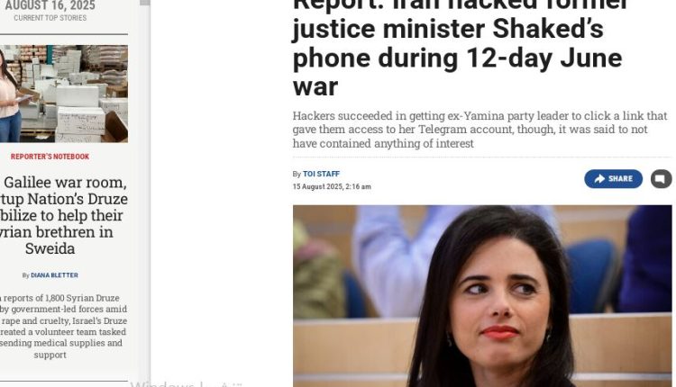 كشف تقريرٌ لـ موقع “تايمز أوف إسرائيل” أن إيران نجحت في اختراق الهاتف الشخصي لوزيرة العدل الإسرائيلية السابقة، أييليت شاكيد، خلال موجة التصعيد العسكري والسيبراني بين الجانبين في يونيو الماضي.