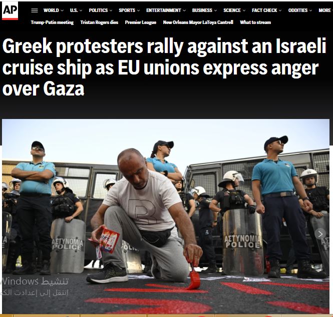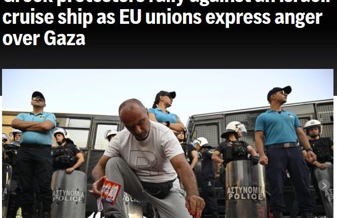 في مشهد يجسد عمق التضامن الشعبي الأُورُوبي مع فلسطين، شهدت عدة مدن وموانئ يونانية احتجاجات واسعة ضد السفن السياحية الإسرائيلية، تنديدًا بالمجازر المُستمرّة التي يرتكبها الاحتلال الإسرائيلي في قطاع غزة.