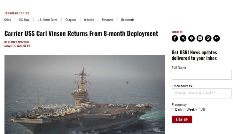 أفاد موقعُ “USNI News” التابع لمعهد البحرية الأمريكية بأن حاملة الطائرات “يو إس إس كارل فينسون” أنهت مهمة بحرية استمرت 269 يوماً في شمال بحر العرب، دون أن تعبر مضيق باب المندب إلى البحر الأحمر.