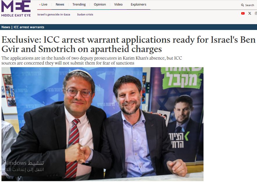أفاد تقرير لـ موقع ميدل إيست أي البريطاني بأن المحكمة الجنائية الدولية أنهت إعداد مذكرات توقيف بحق كُـلّ من وزير الأمن القومي الإسرائيلي إيتمار بن غفير ووزير المالية بتسلئيل سموتريتش، على خلفية اتّهامات بارتكاب جرائم فصل عنصري، في تطور قانوني قد يشكل سابقة أمام العدالة الدولية.