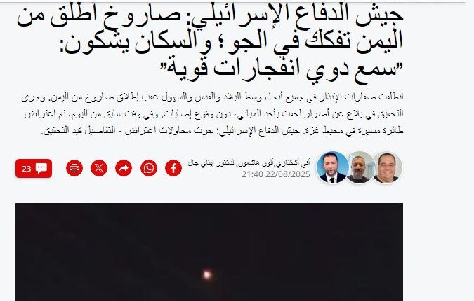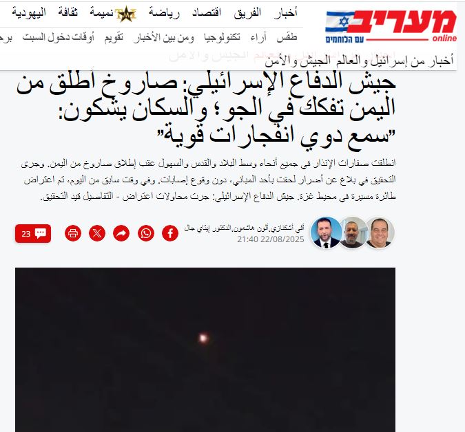 ذكرت وسائلُ إعلام إسرائيلية، مساء السبت، أن صاروخًا أُطلق من اليمن نجح في اختراق منظومات الدفاع الجوي الإسرائيلي، ما تسبب في سماع أربعة انفجارات قوية وسط الأراضي المحتلة.
