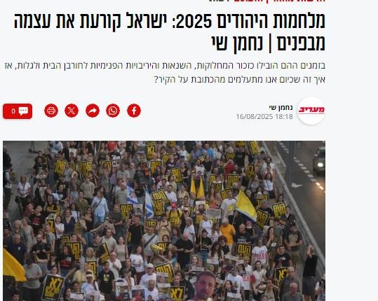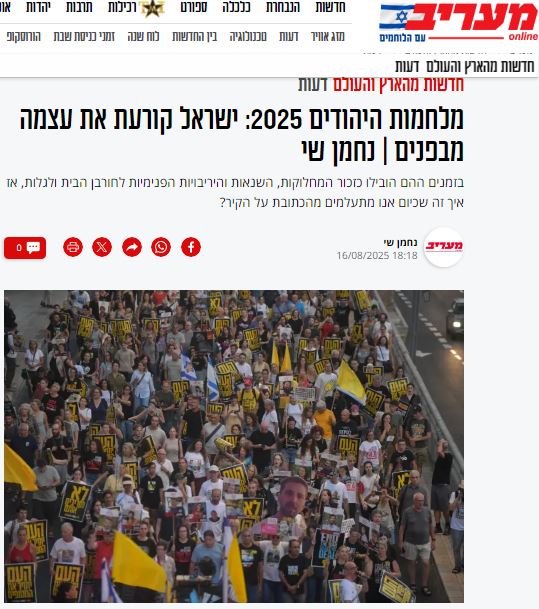 وذكر نحمان شاي، عميد كلية الاتّحاد العبري بمعهد الدراسات اليهودية، ووزير الشتات، والمتحدث باسم الجيش الأسبق، أن “من ينظر لإسرائيل اليوم في عام 2025 سيجد أمامه النسخة المتقدمة والمحدثة من “الحروب اليهودية لأن مئات آلاف الإسرائيليين لا ينامون ليلهم، وقسما كَبيراً منهم لا يغمض عينيه؛ بسَببِ قلقهم الشديد على أبنائهم وبناتهم، وأحفادهم وحفيداتهم، وعلى أفراد عائلاتهم المهدّدين بالموت على بُعد ساعة بالسيارة من منازلهم”.
