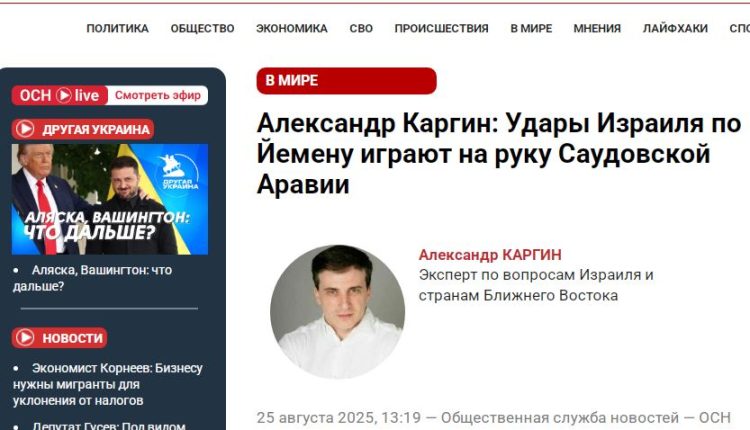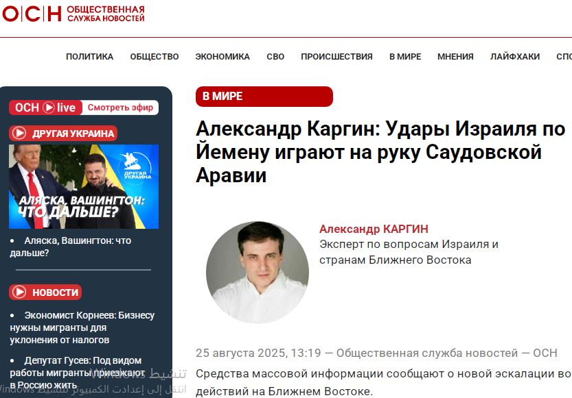 قال الكاتب والمحلل الروسي ألكسندر كارغين، المتخصص في شؤون الشرق الأوسط وإسرائيل، إن الهجمات الجوية الإسرائيلية على الأراضي اليمنية قد تكون نُفذت بالتنسيق مع السعوديّة، في إطار مصالح مشتركة تتقاطع في الملف اليمني.